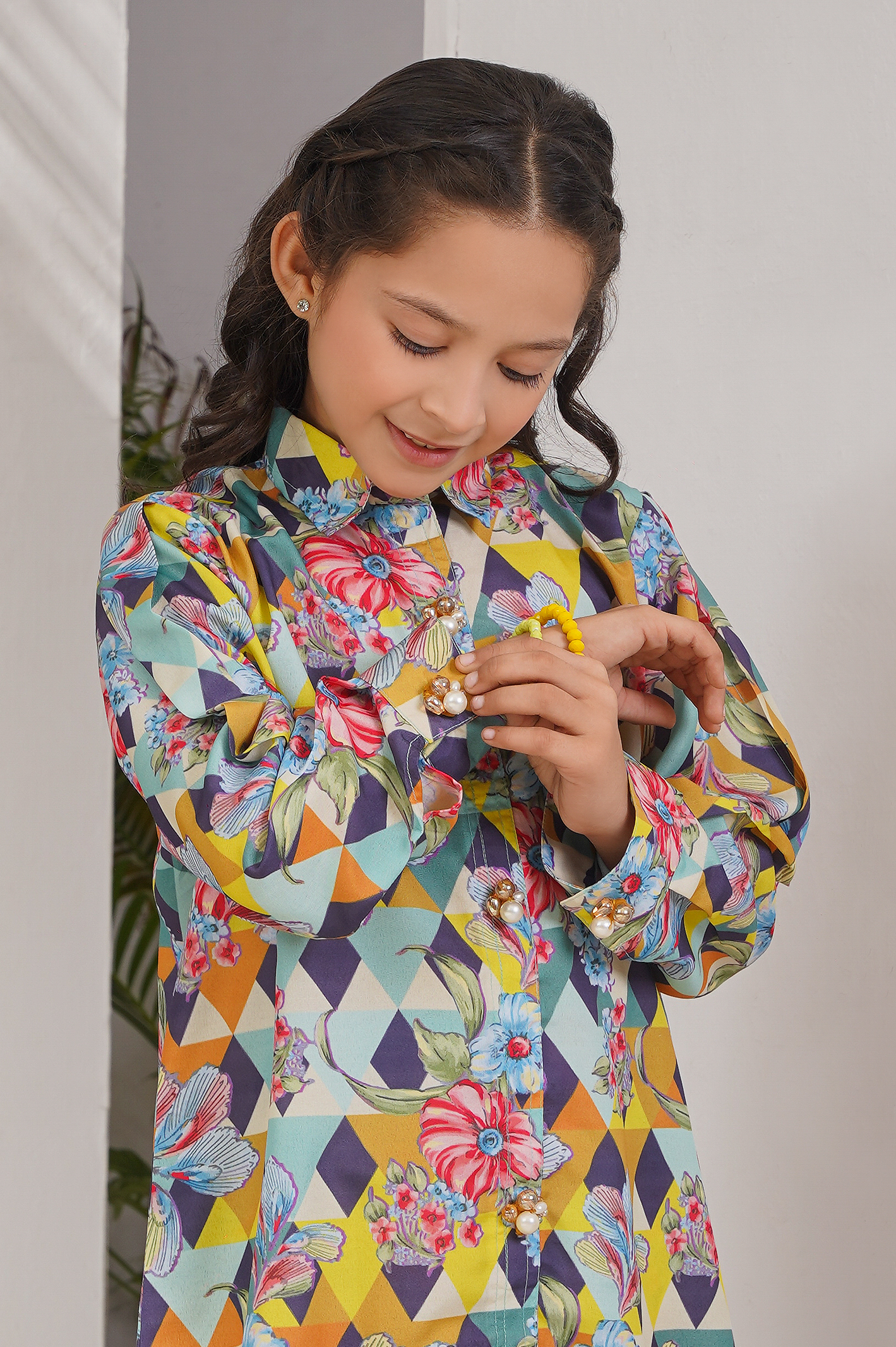 Let your little girl step into vibrant elegance with this eye-catching 2 PC Printed Swiss Lawn Suit for Girls from The Fairy’s Club. Featuring a stunning multicolor geometric pattern blended with delicate floral prints, this outfit is a perfect expression of modern style with playful charm.