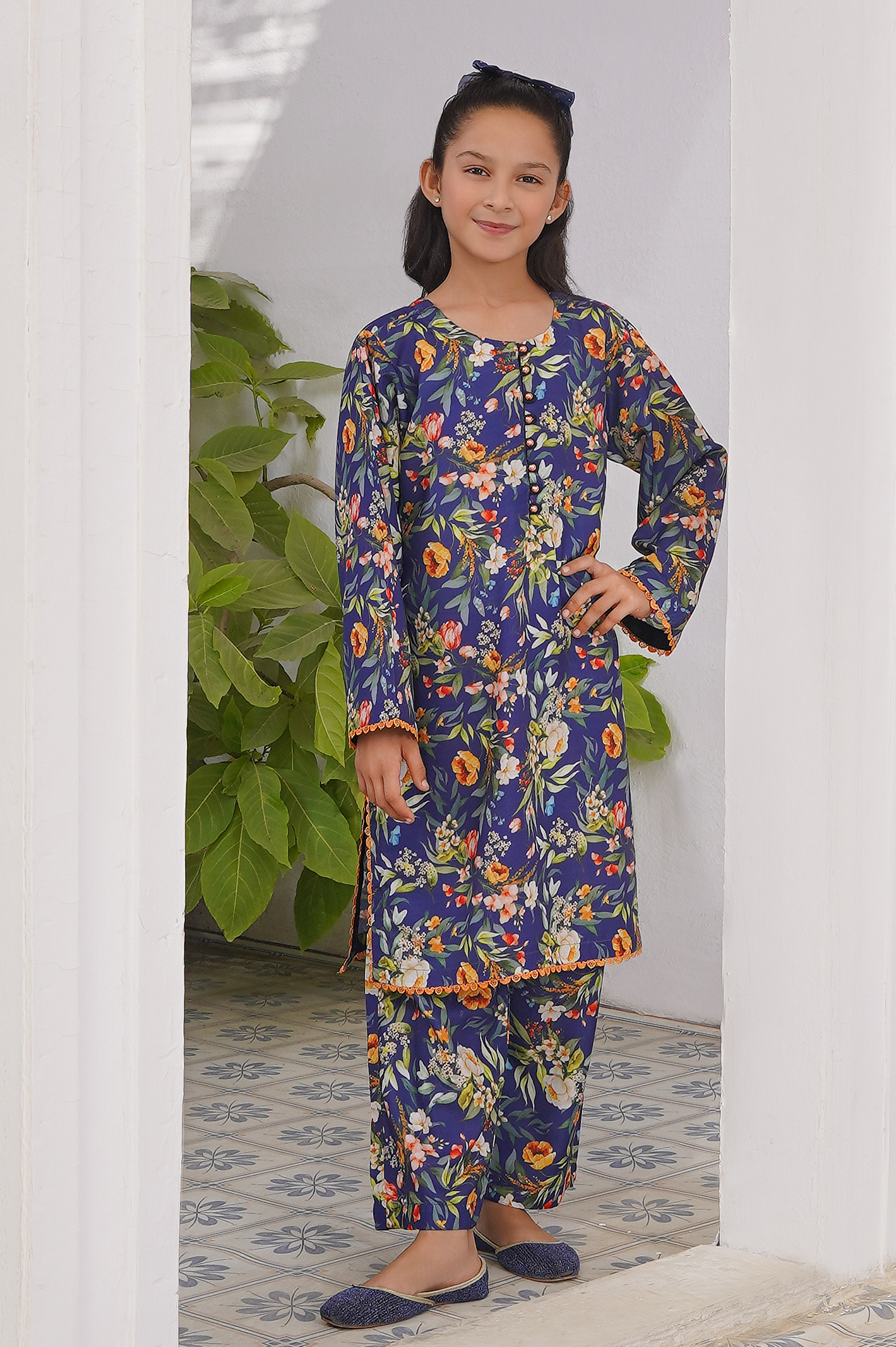 2 PC printed Swiss lawn suit for girls, girls navy blue lawn suit, kids summer lawn wear, floral lawn suit for girls, girls kurta trouser set, Swiss lawn kids dress, girls ethnic wear, The Fairy’s Club girls collection, summer outfits for girls Pakistan.